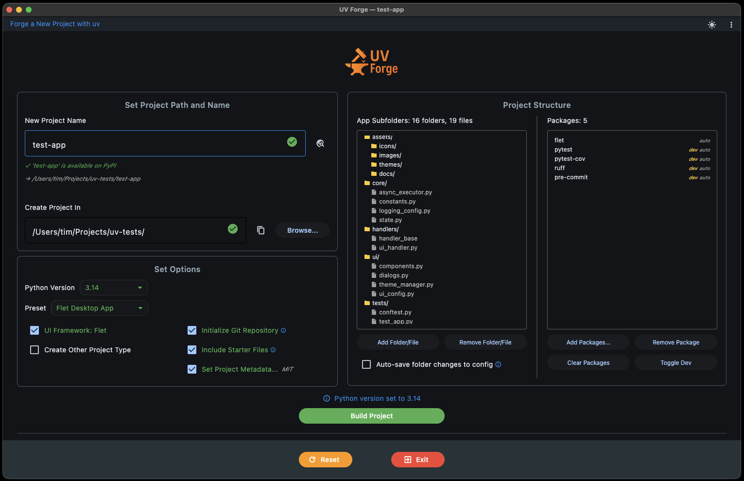 UV Forge is a desktop app that scaffolds production-ready Python projects using the uv package manager. Pick a UI framework, project type, or both — UV Forge generates the folder structure, boilerplate files, packages, virtual environment, git repo, and pyproject.toml in one click.