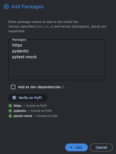 - Packages are listed separately and can be added, removed, or marked as dev dependencies