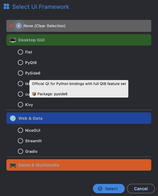 Select from Python 3.10 through 3.14 using the dropdown. The version is written into .python-version and pyproject.toml.